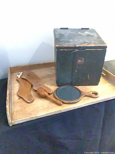 Antique Dough Board, Sock Darner, Primitive Black Wooden Box etc