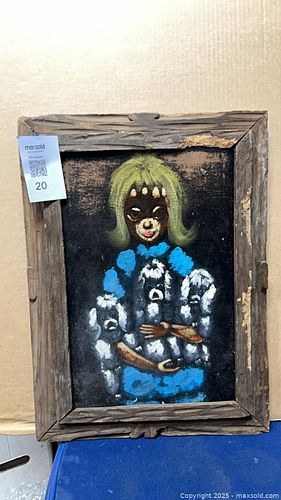 Framed Vintage Oil on Velvet Portrait of Girl with Dogs, Naive/Folk Art, 16”x 23”